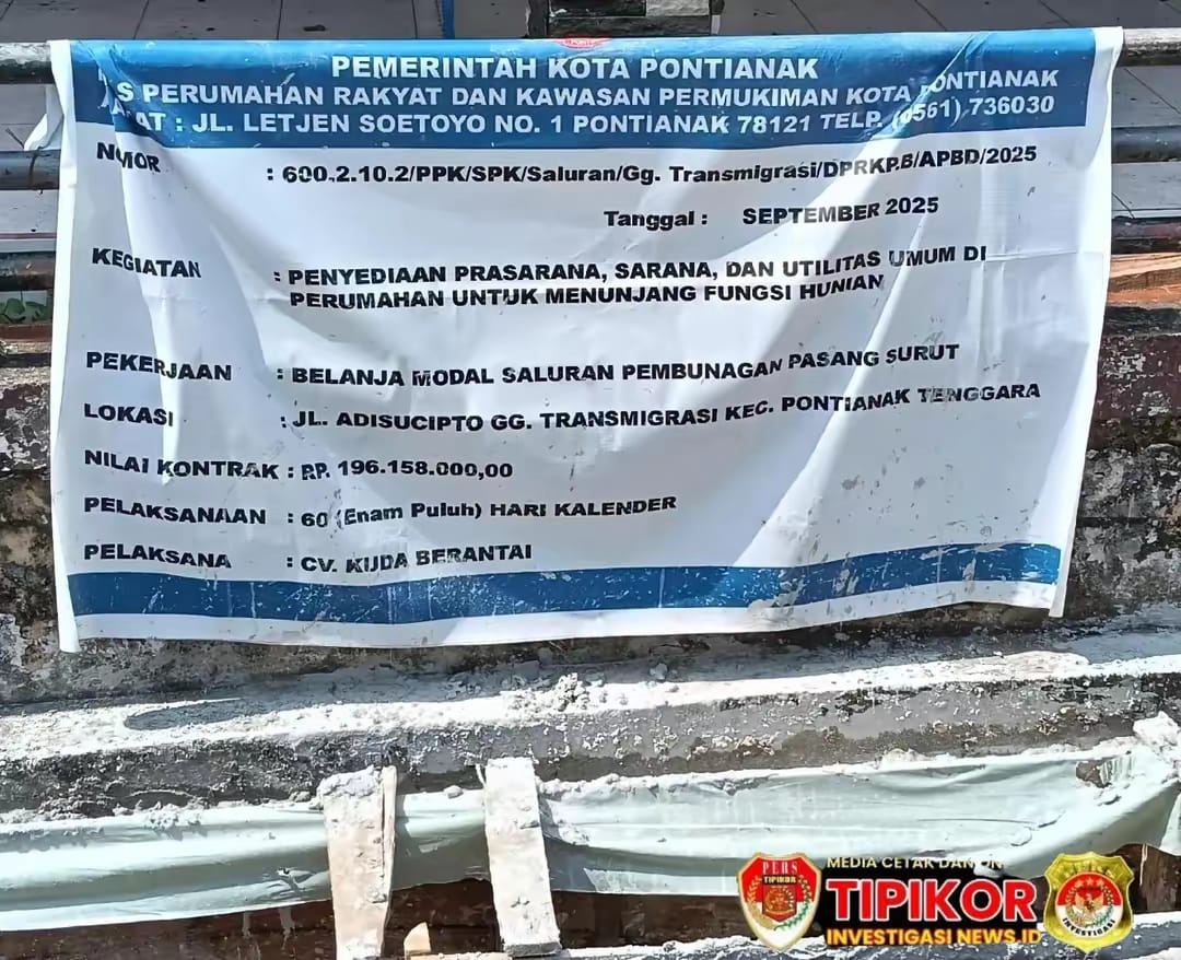 Timenusantara.top.Pontianak,Provinsi Kalimantan Bagian Barat Saluran Pembuangan Air yang Dikerjakan CV.KUDA BERANTAI berada di jalan Adisucipto Gg Transmigrasi kec, Pontianak tenggara. No.SPK:600,,2,,10.2/PPK/SPK/Saluran/DPKP.B/APBD/2025 menjadi sorotan publik.Sabtu/1/11/2025/
