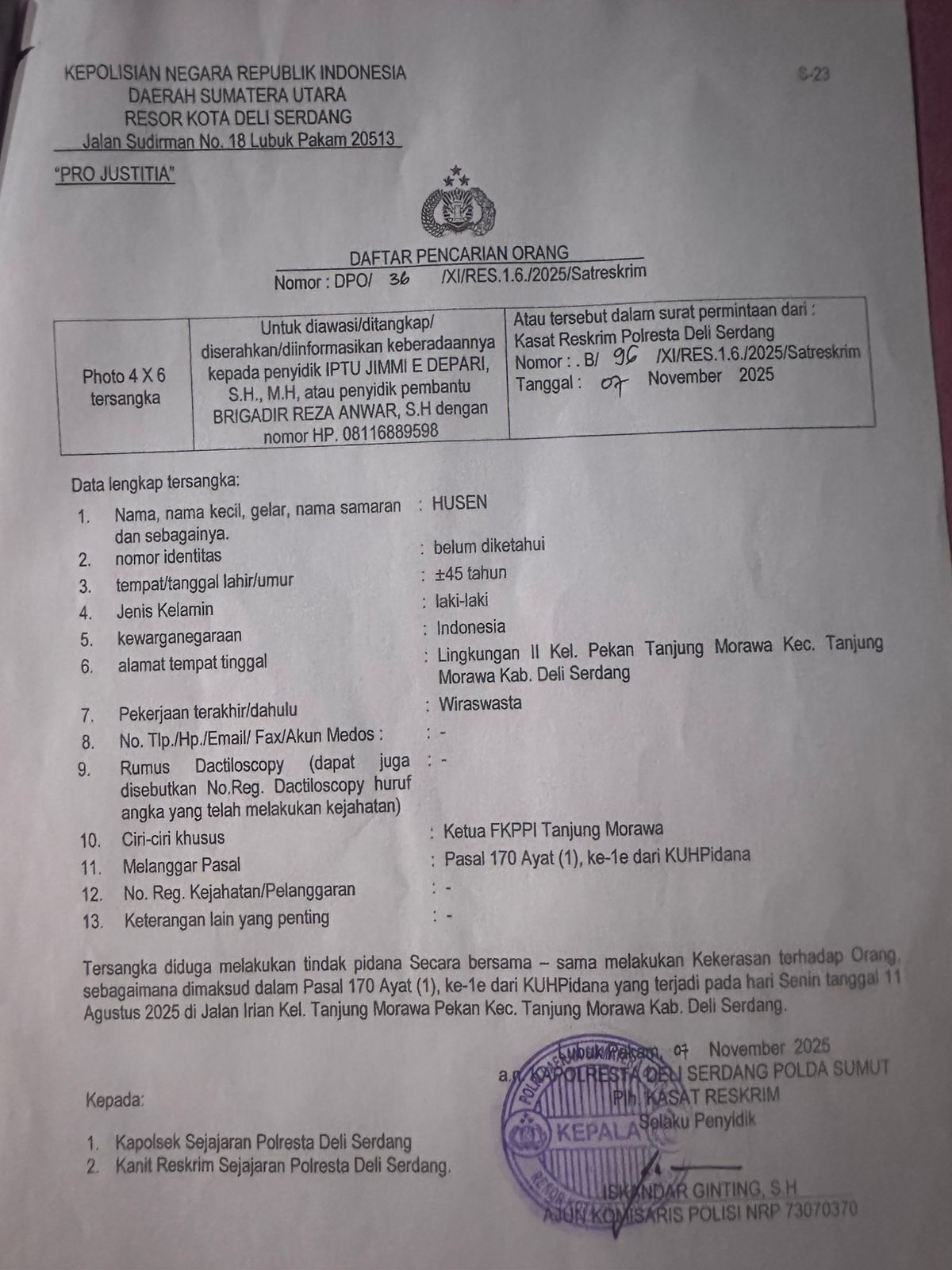 Menerangkan data lengkap tersangka DPO, bernama Husen (45), warga Lingkungan ll Kelurahan Pekan Tanjung Morawa, Kecamatan Tanjung Morawa, Deli-Serdang, ungkap Okiyanti, Kepada Wartawan, Senin, 08 Desember 2025.